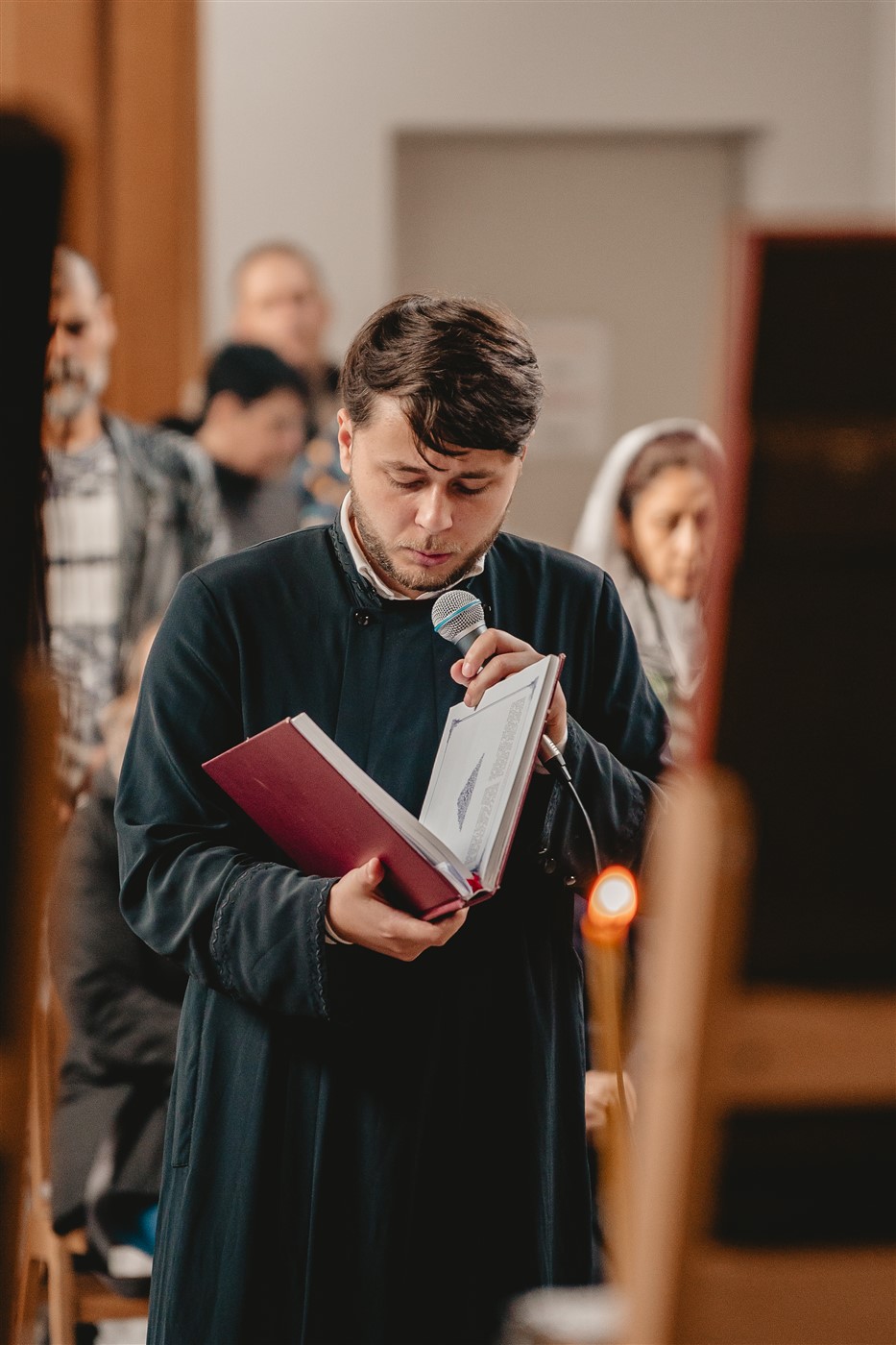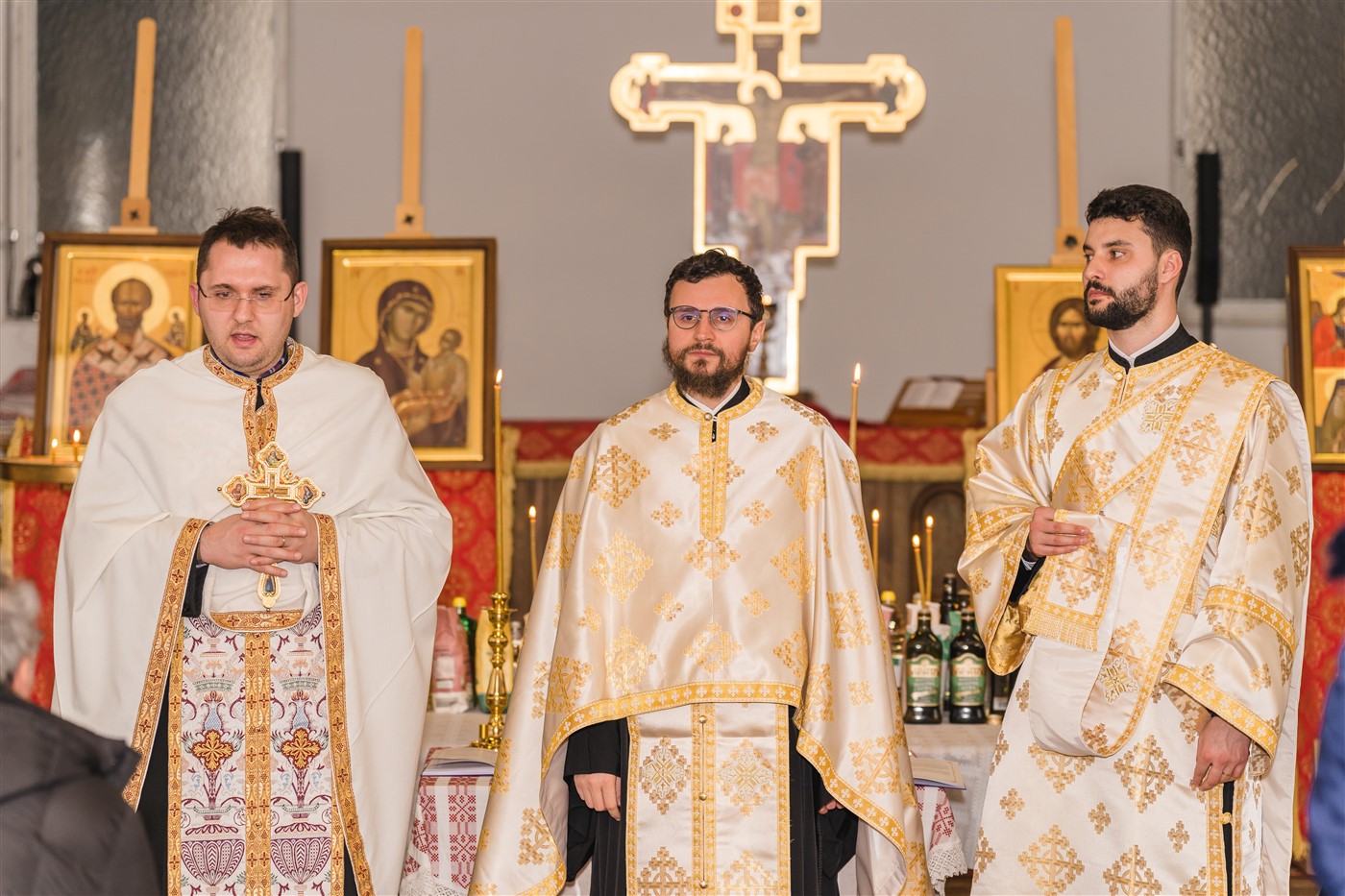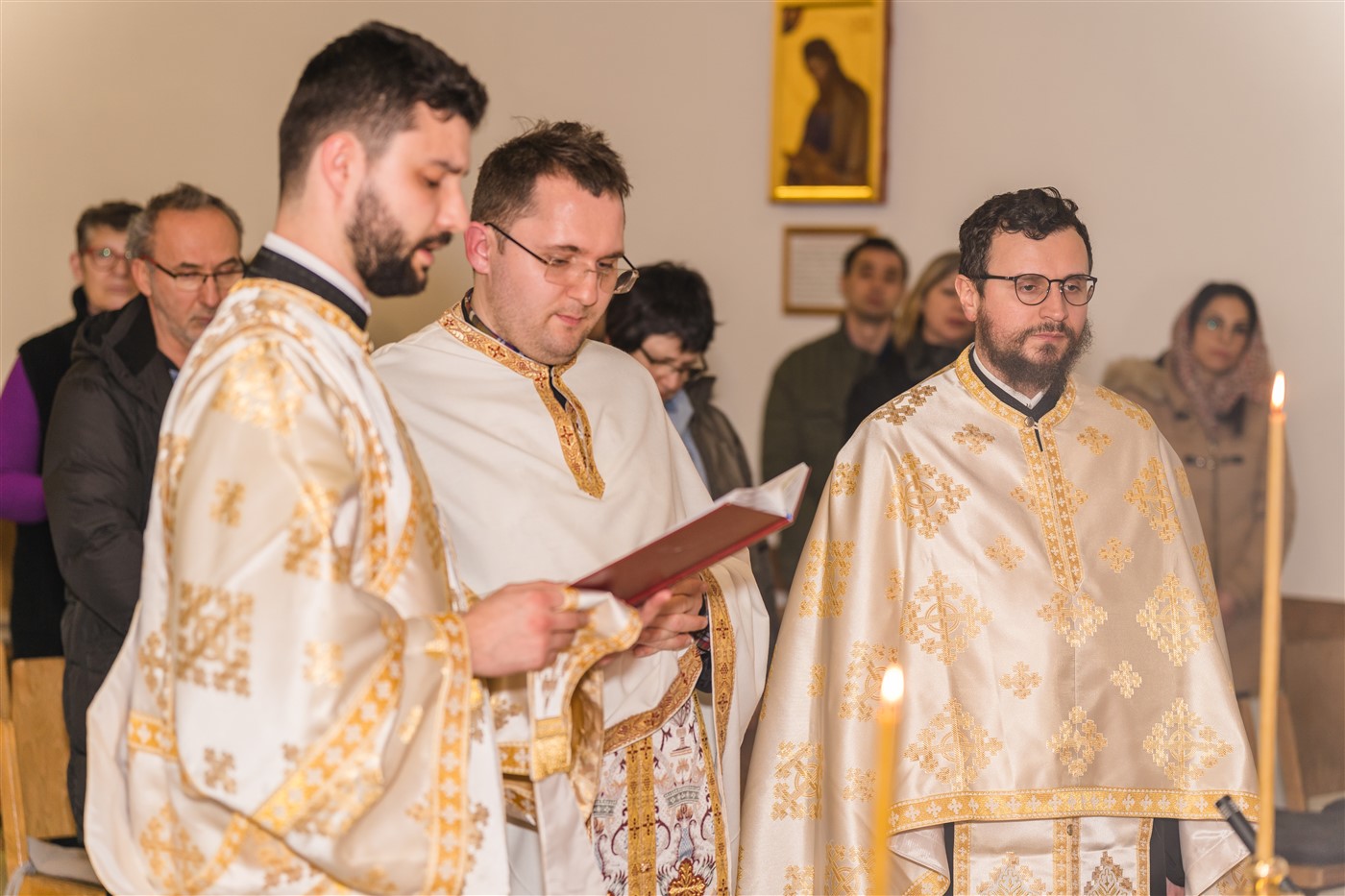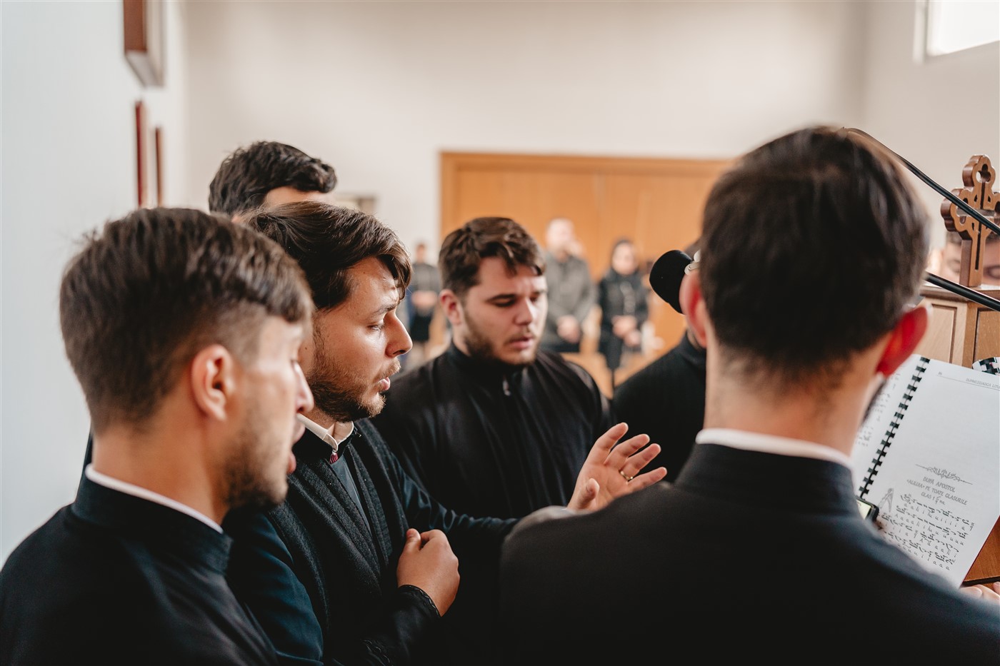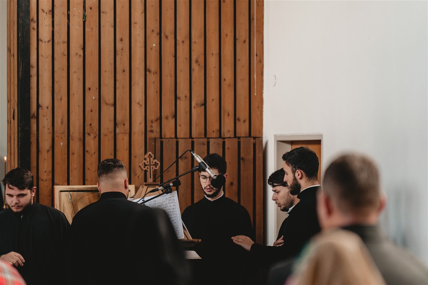Răspunsurile la strană au fost date în limba germană, în stil bizantin, de tinerii Matthias El-Far, Ammar Sayegh, la care s-a alăturat și protopsaltul român Claudiu Morteanu.