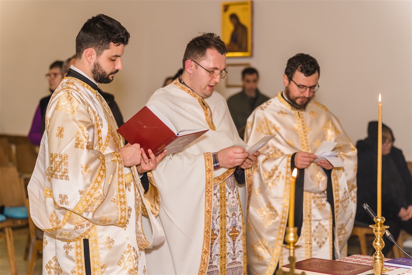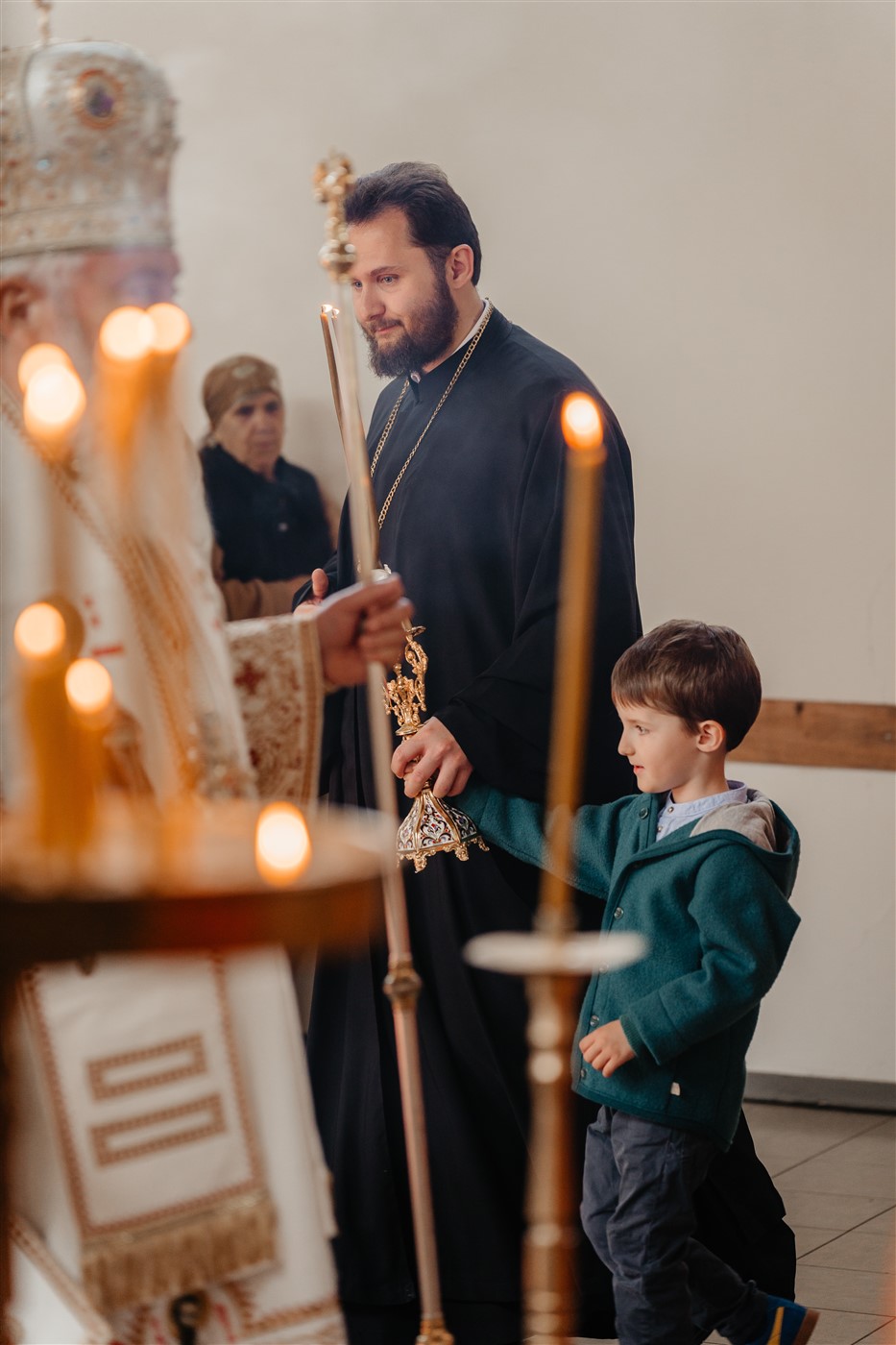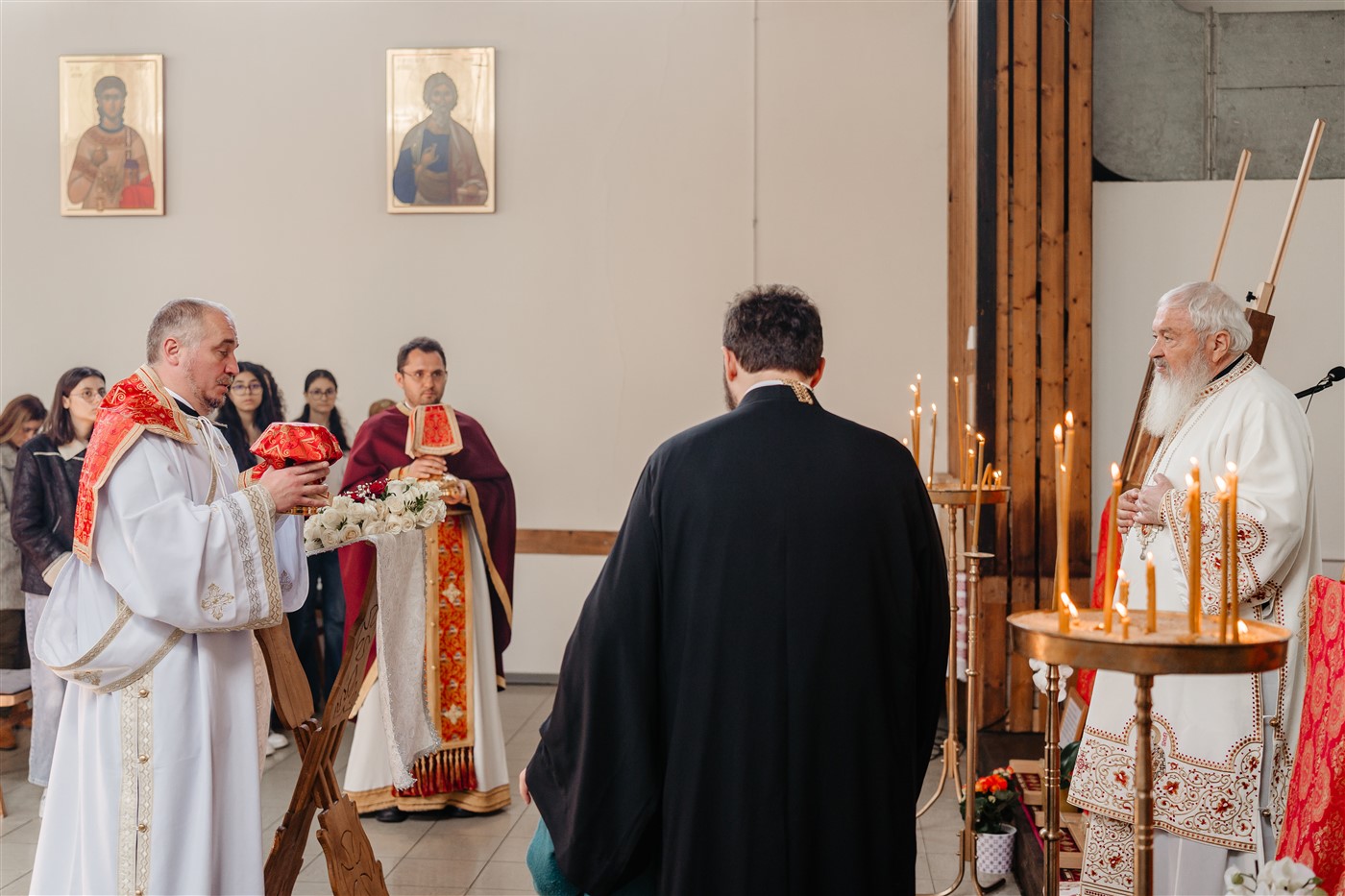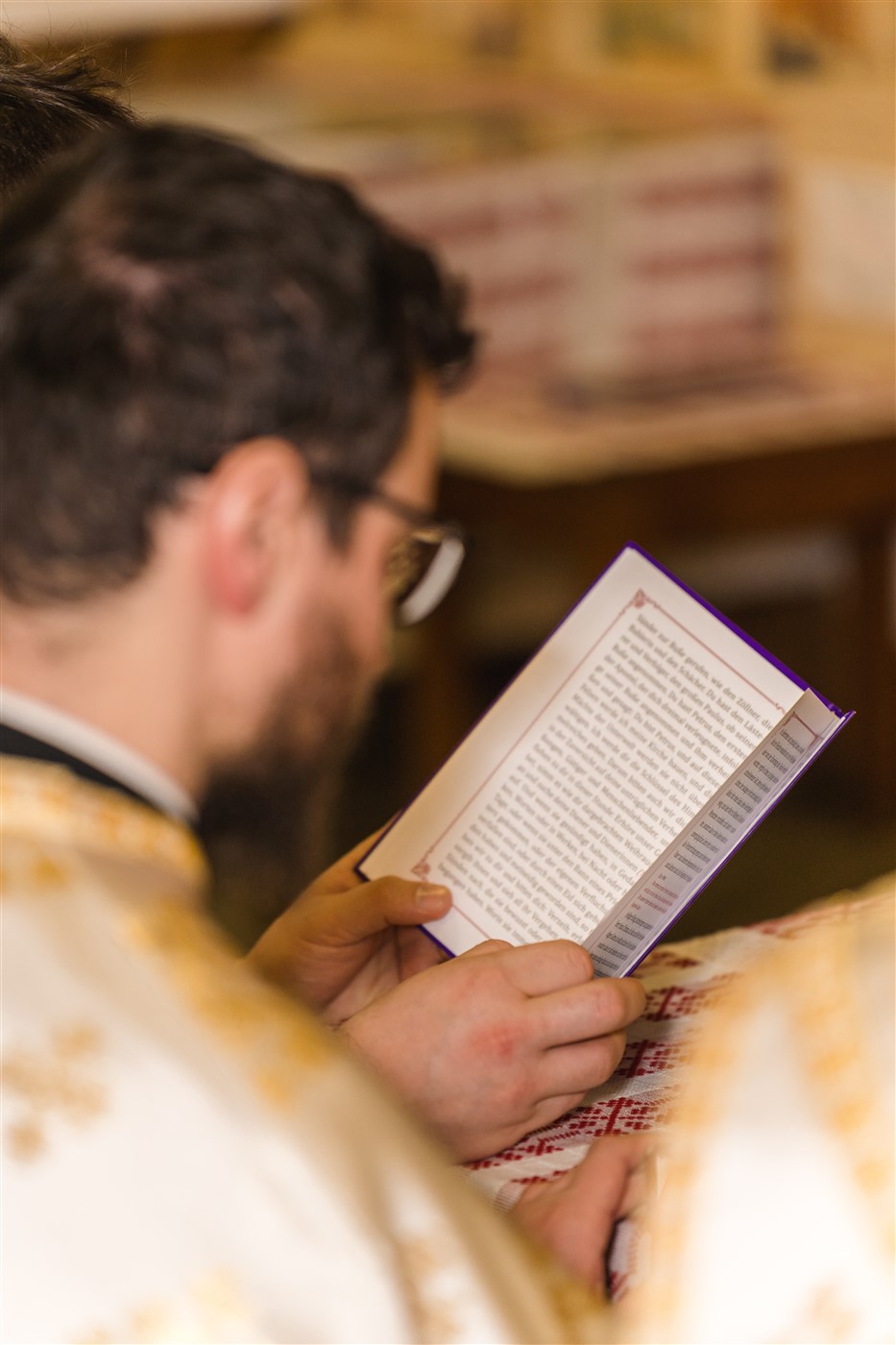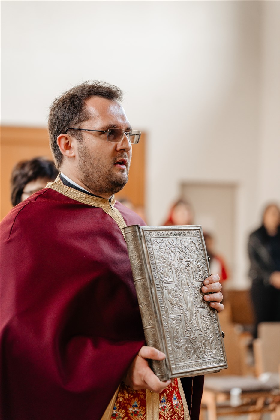Răspunsurile la strană au fost date în limba germană, în stil bizantin, de tinerii Matthias El-Far, Ammar Sayegh, la care s-a alăturat și protopsaltul român Claudiu Morteanu.